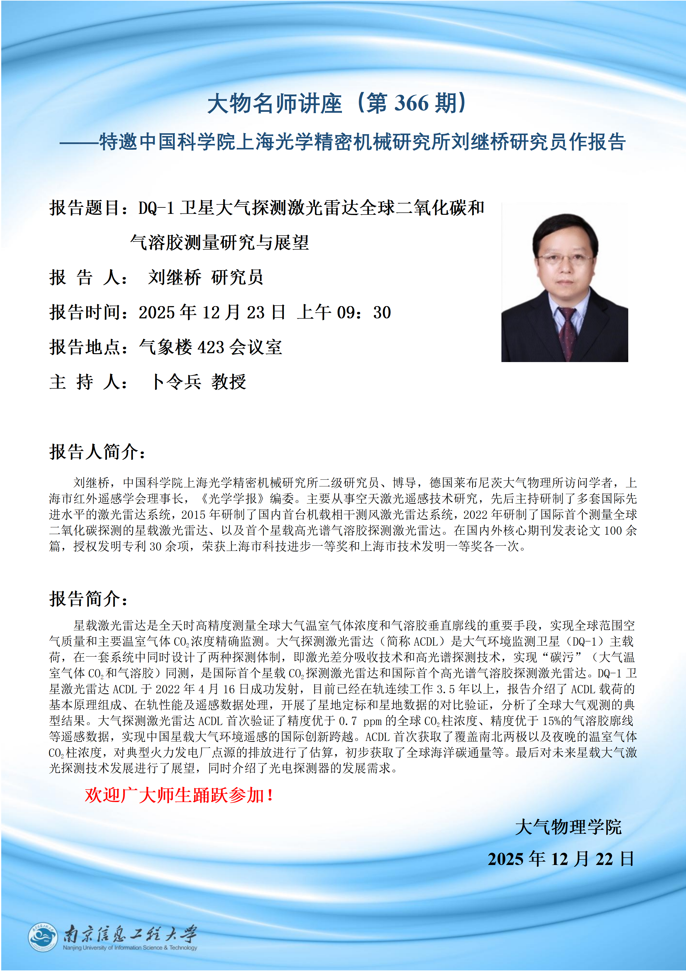 大物名师讲座(第366期)——特邀中国科学院上海光学精密机械研究所刘继桥研究员作报告
