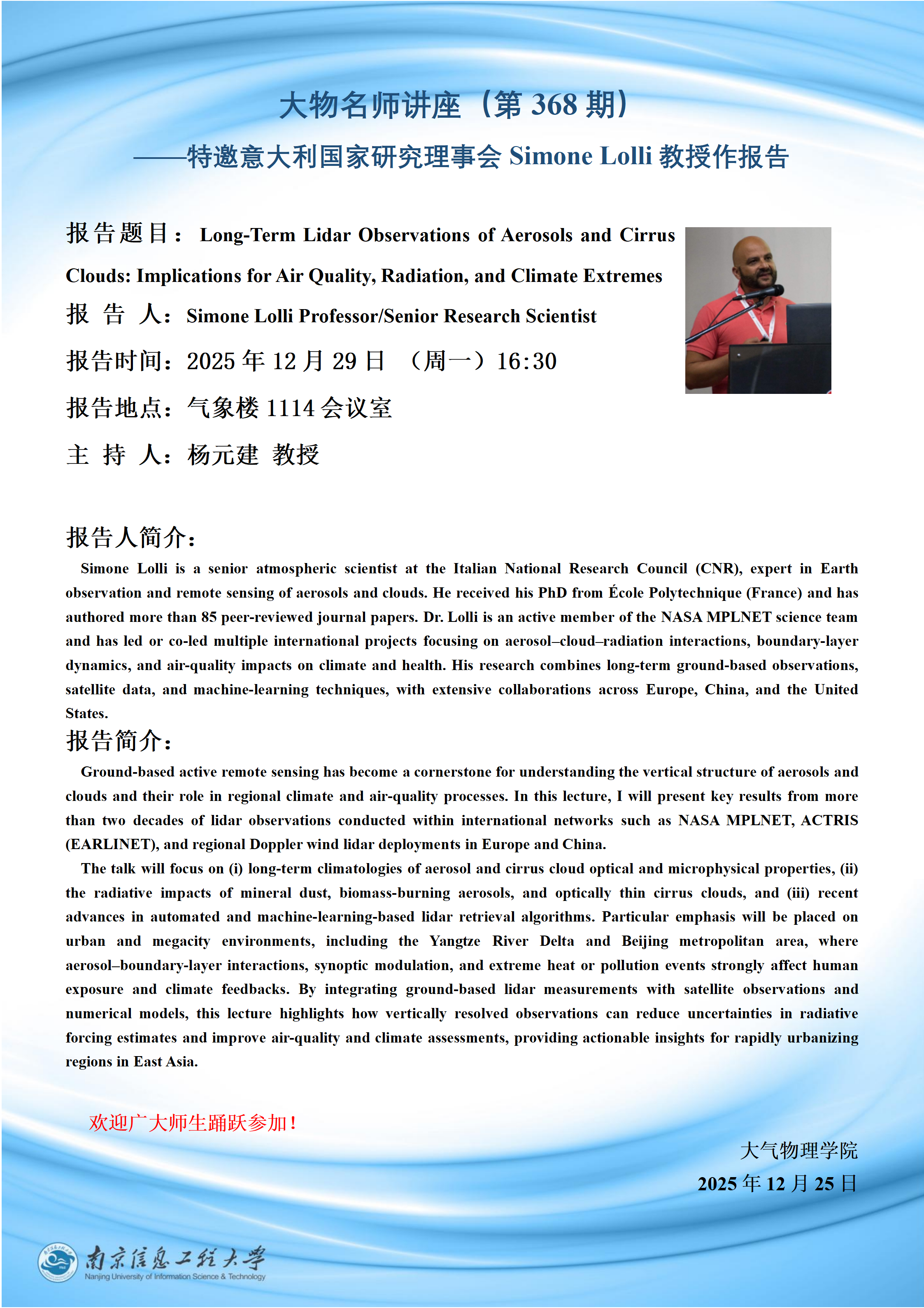 大物名师讲座(第368期)——特邀意大利国家研究理事会Simone Lolli教授作报告