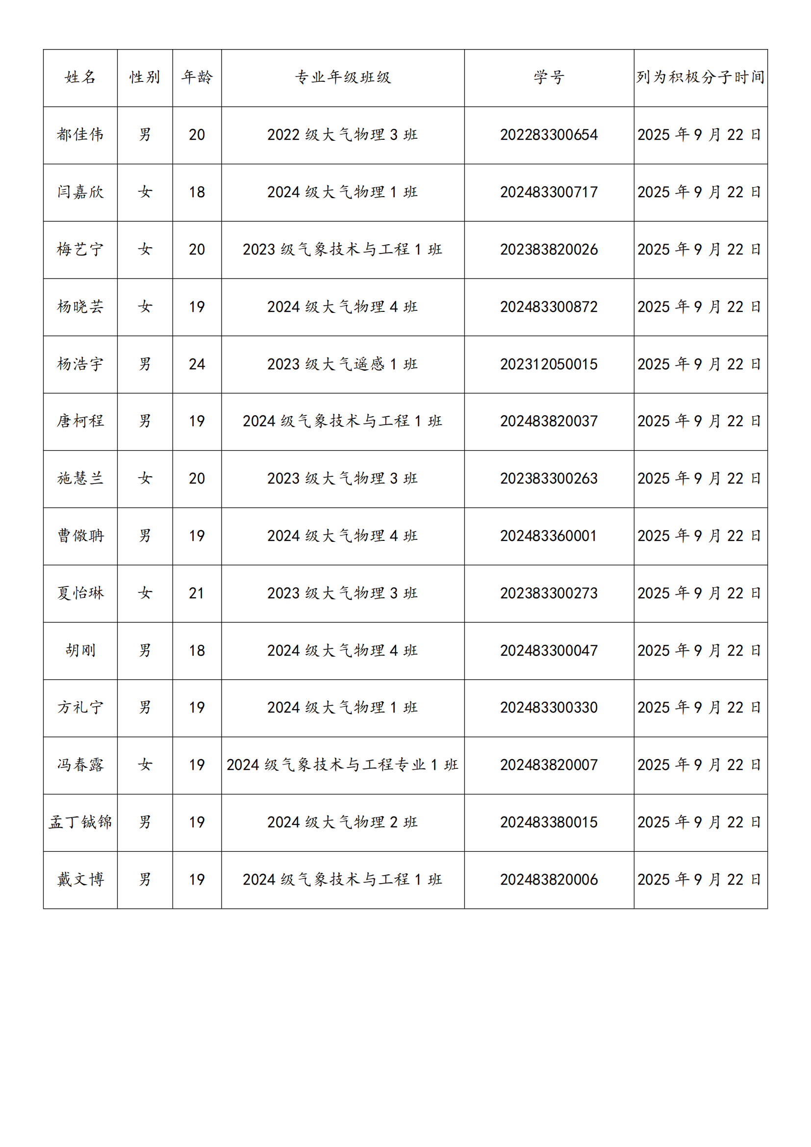 经征求团员群众意见,大气物理学院团委集体研究决定,拟将都佳伟等14名同志列为发展对象,现予以公示。公示时间:2025年10月25日至10月31日。如公示对象存在问题,欢迎广大团员群众通过来电、来信、来访反映。以个人名义信函反映问题提倡署真实姓名。