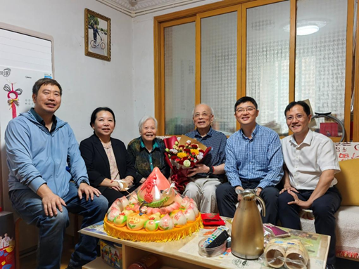 秋雨送爽,温情满溢。9月26日上午,大气物理学院副院长陆春松、院党委副书记、副院长陈建坤、院工会委员蒋惠等一行,代表学院全体师生前往茶亭社区,为我院退休教师周文贤庆贺九旬寿辰。校离退休干部党工委书记、离退休工作办公室主任周斌及离退休管理科邱学军老师一同参与慰问。