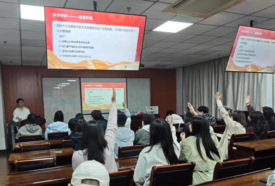 为巩固学习成果、深化思想认识,支部精心组织了“绿水青山知多少”知识竞赛。支部党员同志们踊跃抢答,现场气氛热烈。通过寓教于乐的形式,大家在轻松愉快的氛围中进一步加深了对“两山论”核心要义的理解,增强了生态换届保护意识与科研报国的责任担当。