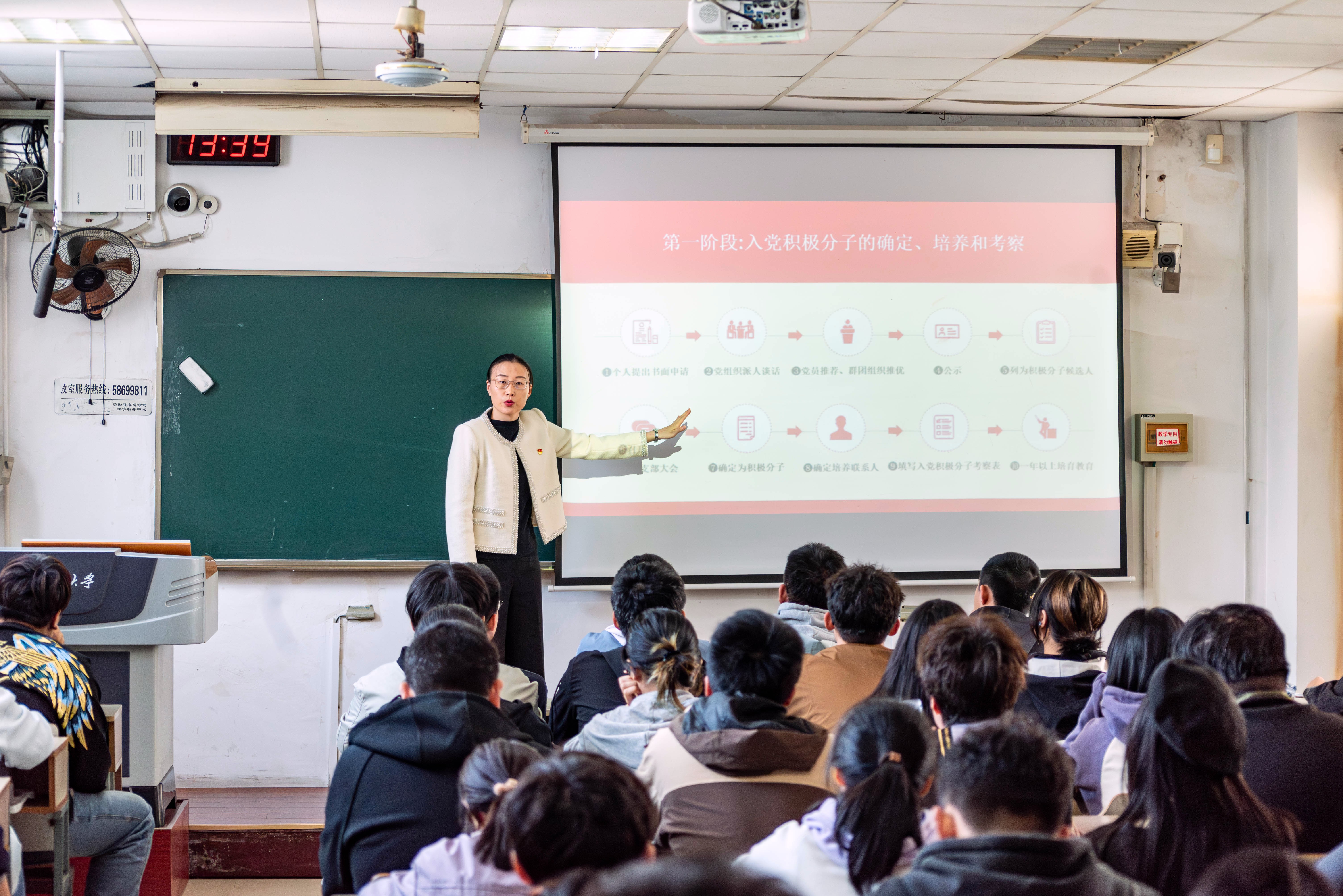 本次党课以“铸魂育新凝初心 向党看齐新征程”为主题,聚焦党史学习与入党实践两大核心。马超俊老师结合鲜活党史案例,回顾中国共产党发展历程,深刻阐释“全心全意为人民服务”的根本宗旨及“为人民谋幸福、为民族谋复兴”的初心使命,引导学生在历史与现实对照中深化对党的性质宗旨的认知。王维维老师则围绕入党全流程规范,系统讲解申请条件、培养考察、材料提交等关键环节,明确时间节点与标准要求,为学生提供清晰指引。