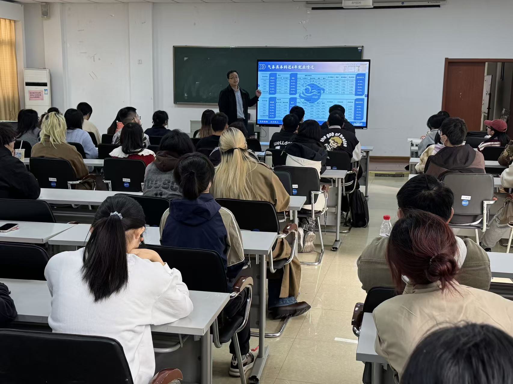 活动中,朱明康系统梳理了近四年来气象类本科及研究生的就业与深造数据。数据显示,学院本科生深造率持续保持在45%以上,其中国内升学率接近45%,远超全校平均水平;研究生体制内就业比例高达75.79%,其中气象部门就业占比近六成,体现出气象类专业在公共服务领域的显著优势。与此同时,学院毕业生就业地域分布广泛,涵盖江苏、浙江、新疆、广东等多个省份,展现出“服务全国、扎根一线”的就业特点。
