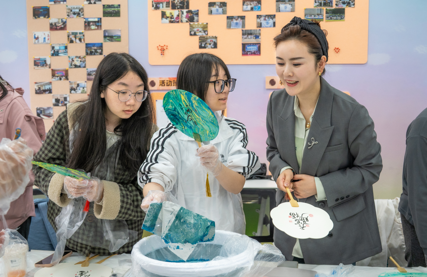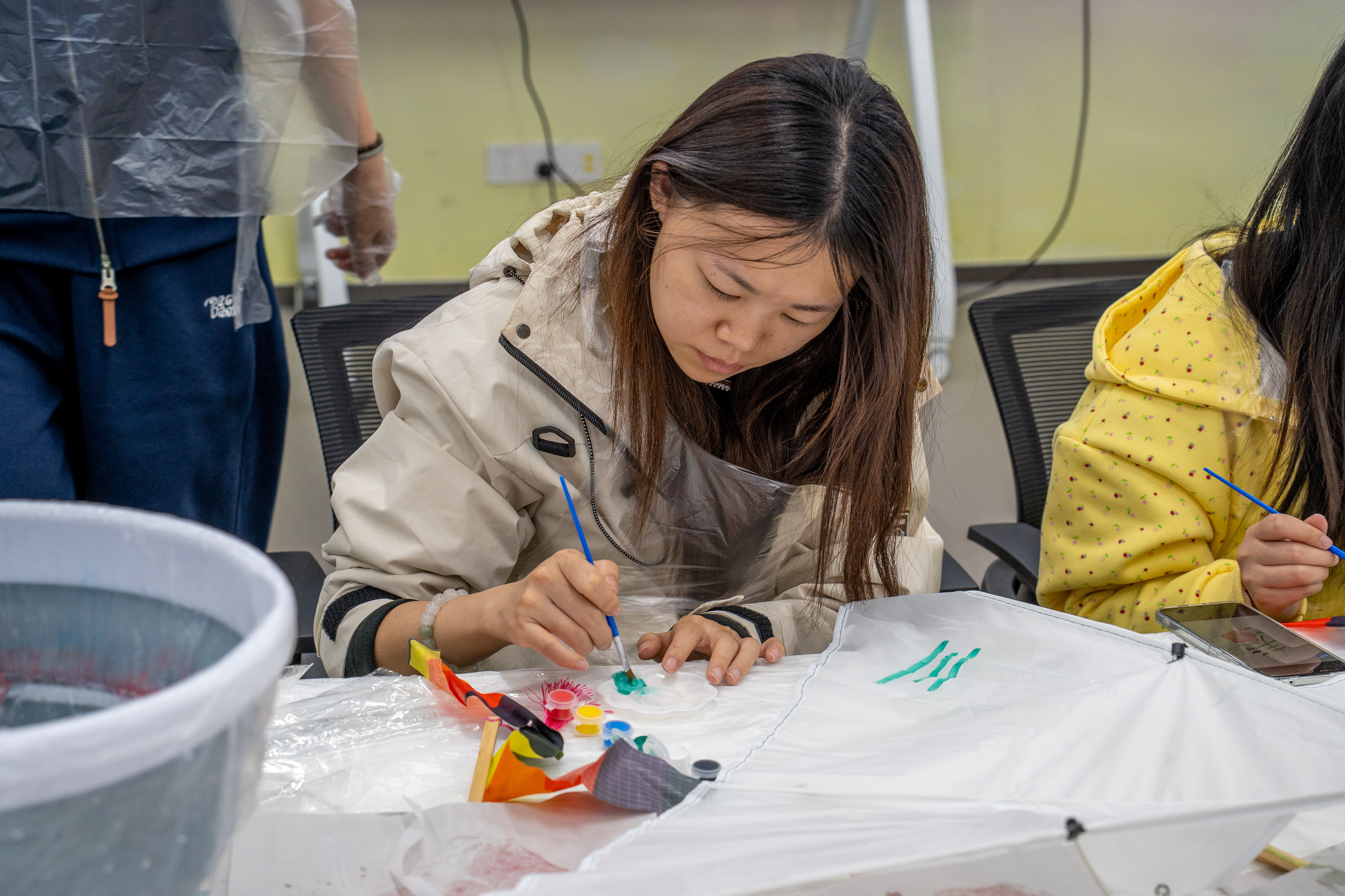 在实践环节,同学们分组参与漆扇与风筝的制作过程。漆扇制作区,大家学习绘制、上漆等基础工艺,体验色彩与材质交融的细腻变化;风筝制作区,同学们则从扎骨架、糊纸到绘画装饰,完整完成一只传统风筝的制作。整个过程中,同学们全神贯注、互帮互助,既锻炼了动手能力,也在慢工细活中有效舒缓了学习与科研带来的压力。