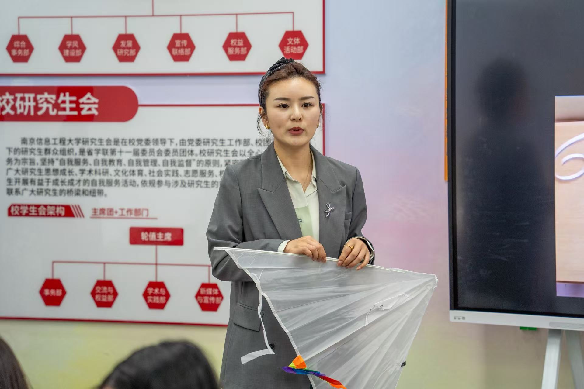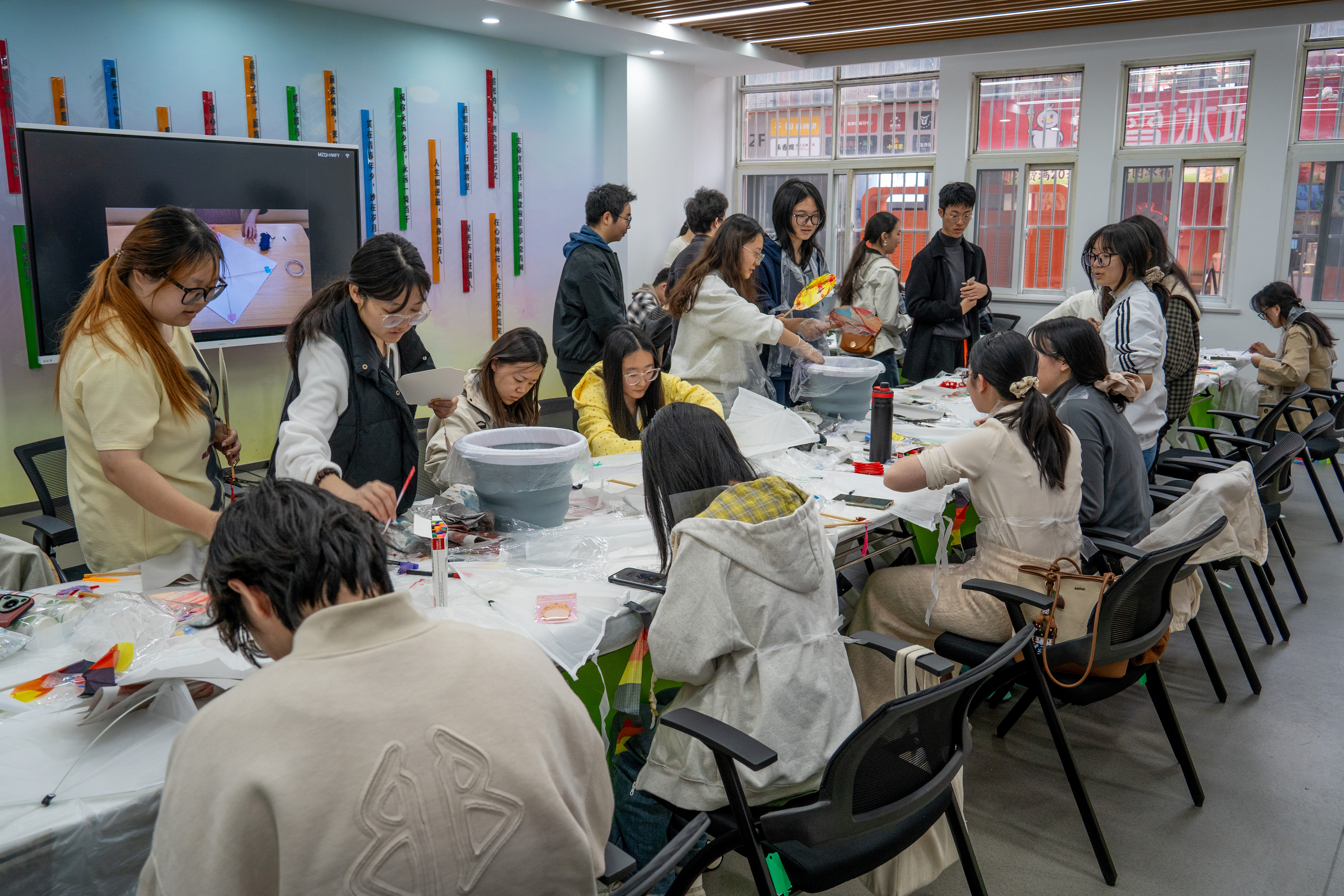 活动伊始,于靖欢老师为同学们讲解了漆扇的历史渊源与工艺特色,以及风筝的起源、流派与文化寓意。讲解了贯穿两种技艺的工匠精神——从漆扇的髹漆绘制到风筝的扎糊绘放,每一道工序都体现出专注、细致与传承的力量。现场同步循环播放非遗宣传短片,进一步营造了浓厚的传统文化氛围。