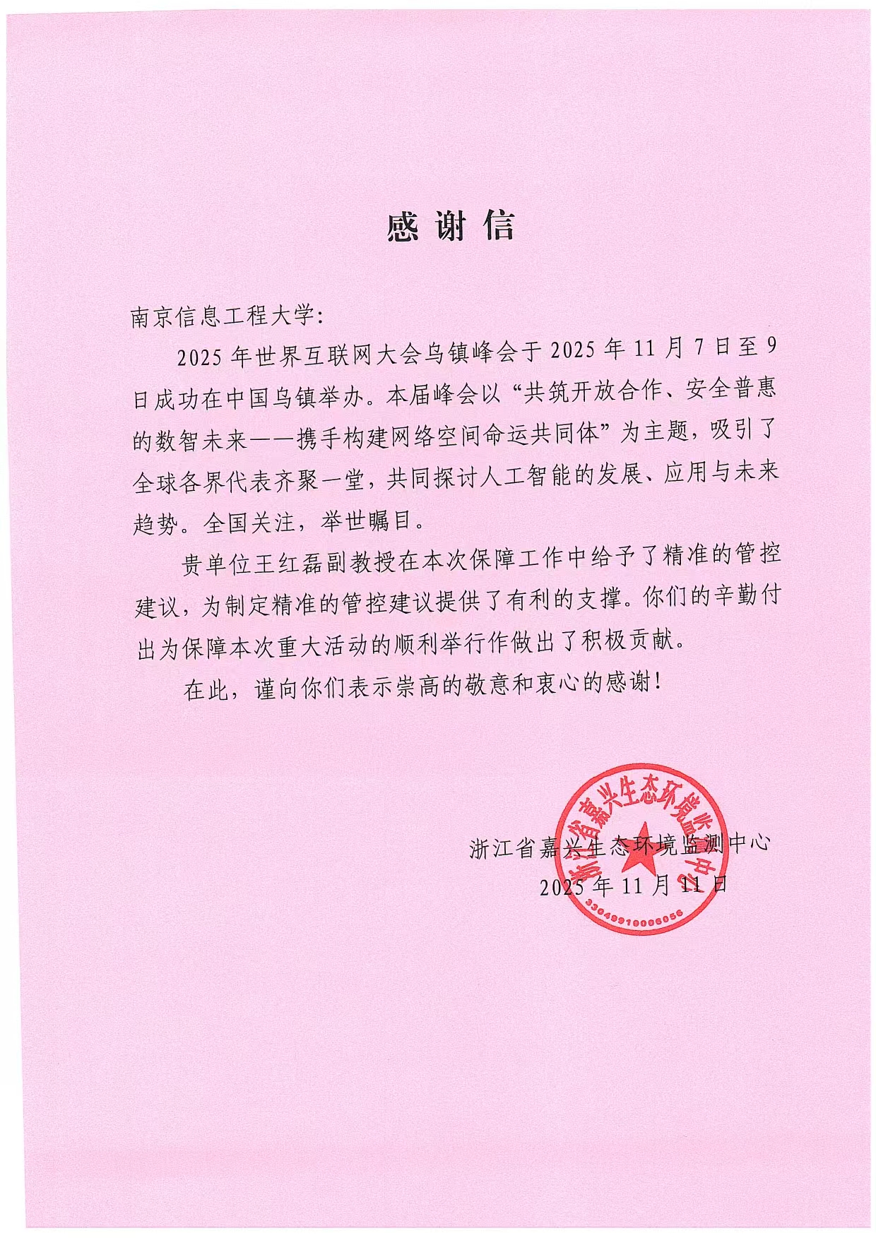 近日,浙江省嘉兴生态环境监测中心向我院发来感谢信,对我院王红磊副教授在空气质量精准保障、大气污染形势预报预警和制定精准的管控建议等方面给予2025年世界互联网大会·乌镇峰会空气质量保障工作中的支持帮助表示诚挚感谢。