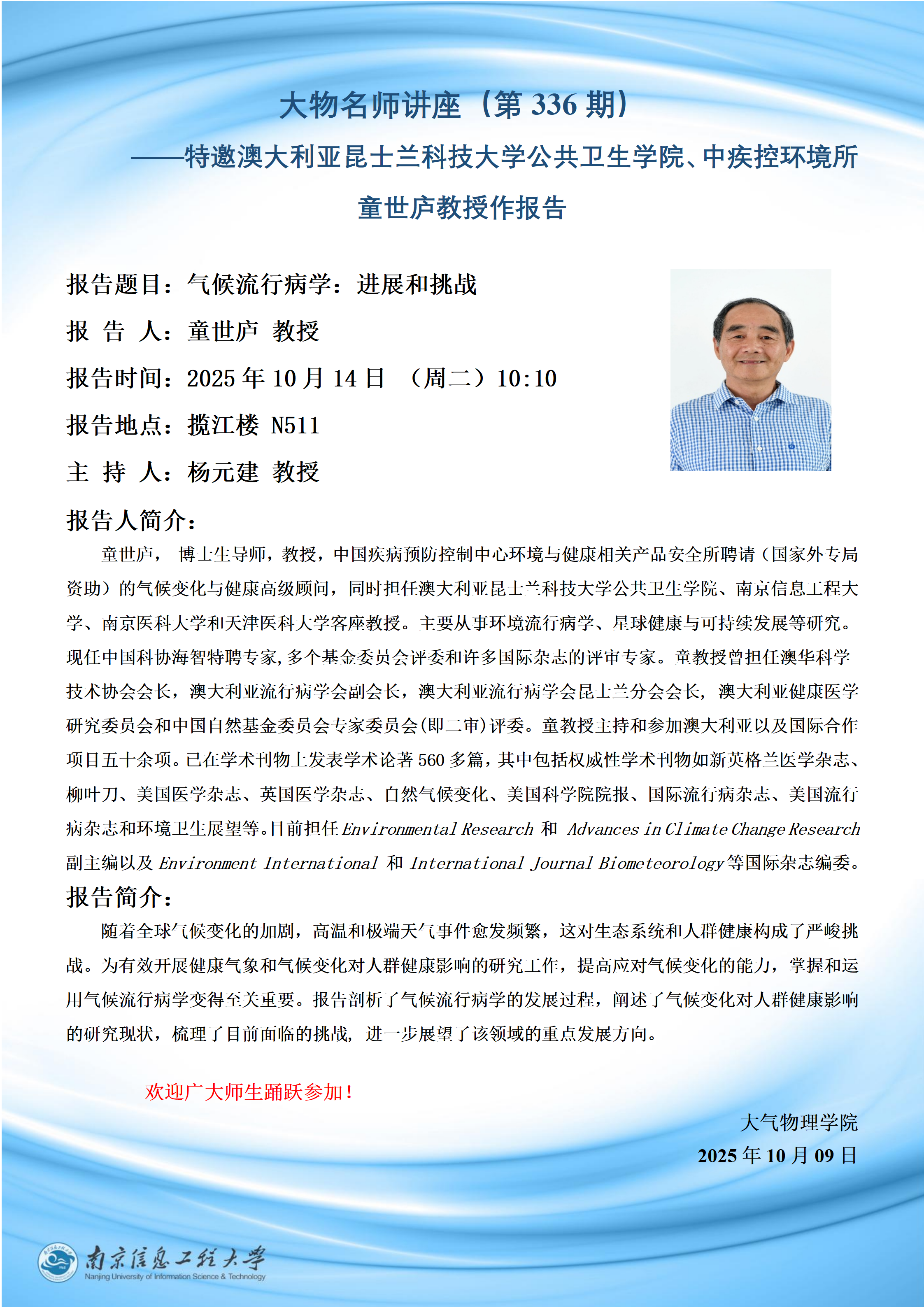 特邀国家卫星气象中心总工程师卢乃锰研究员来校作学术交流