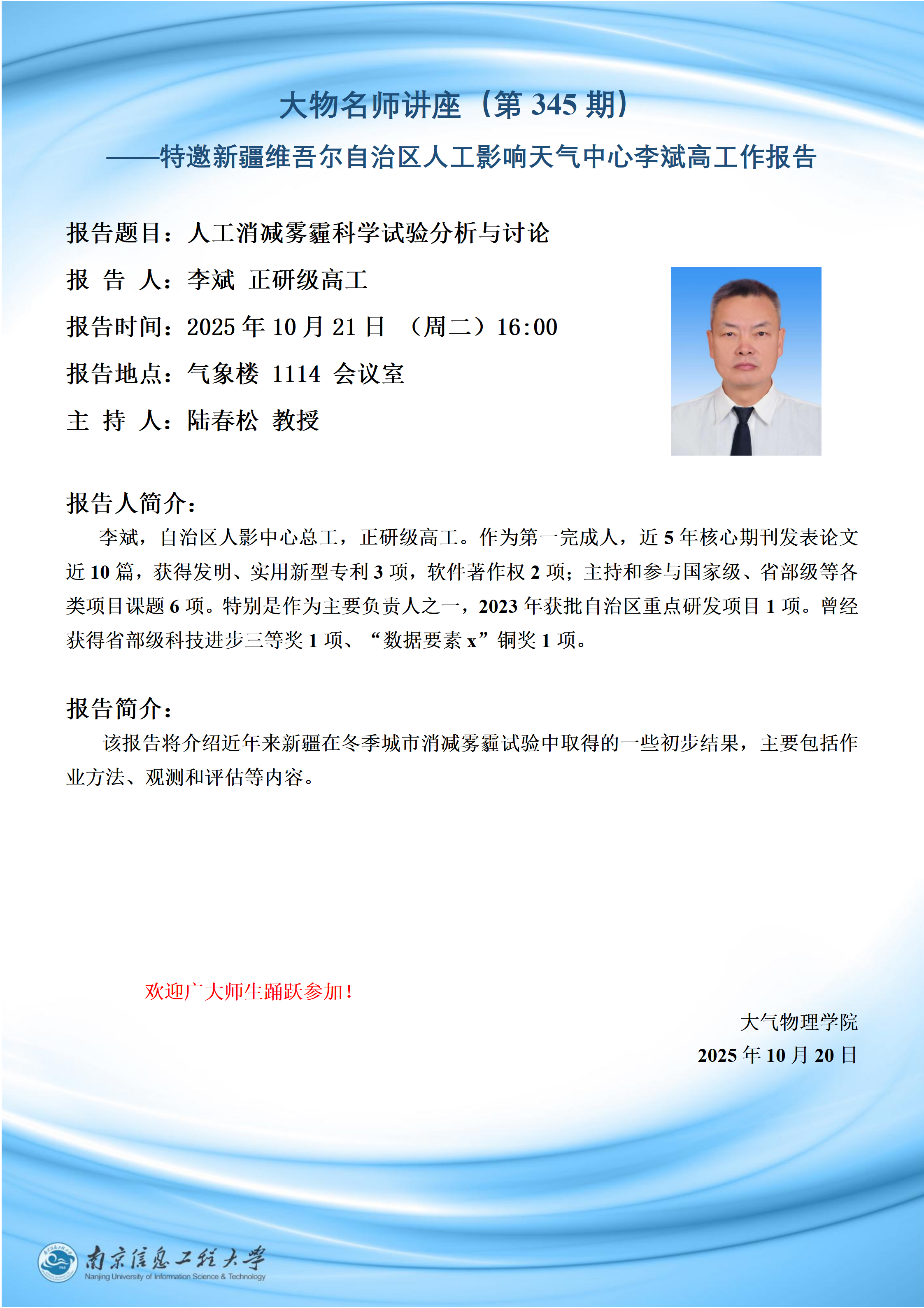 上一条:大物名师讲座(第346期)——特邀新疆维吾尔自治区人工影响天气中心李圆圆高工作报告