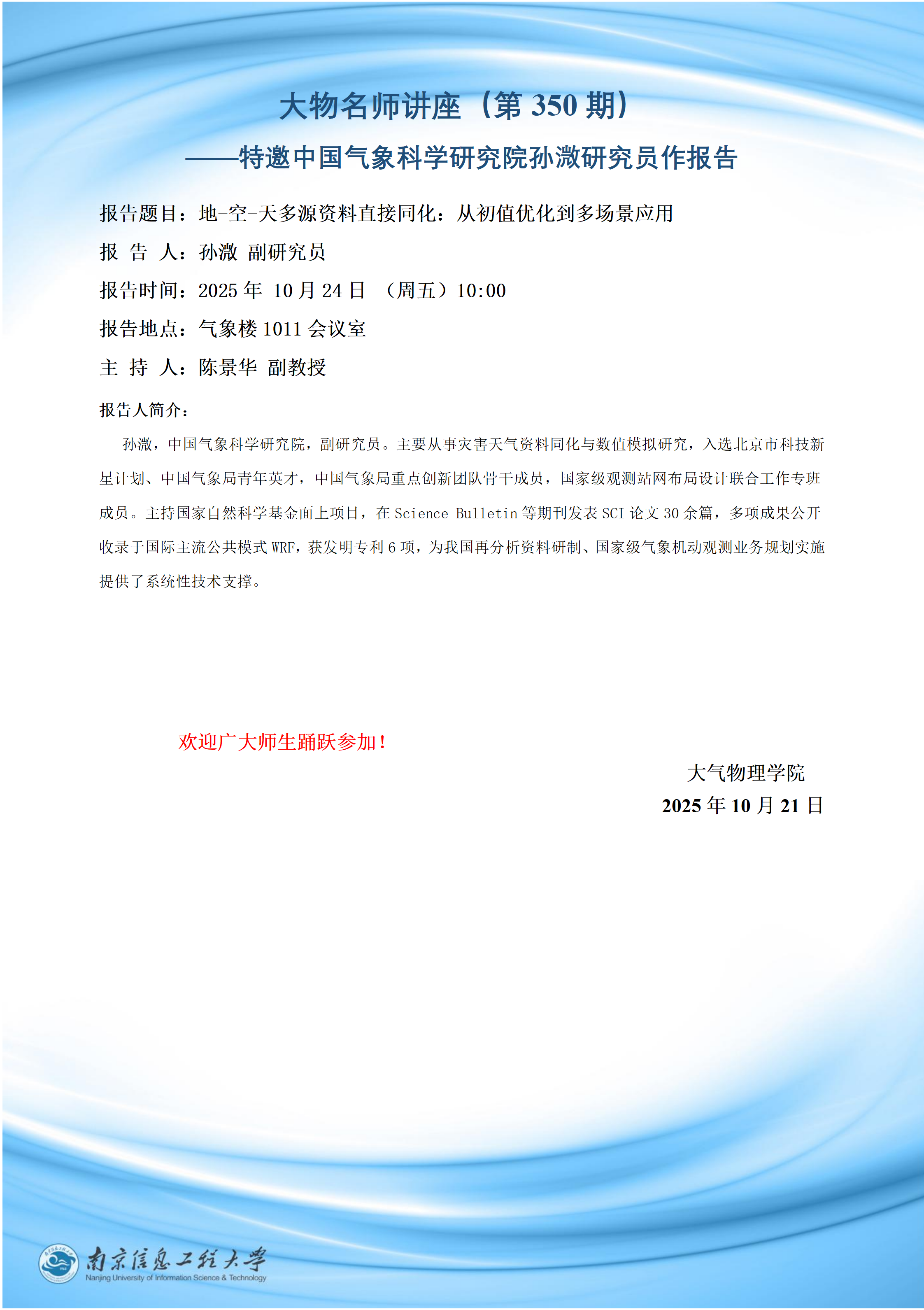 特邀国家卫星气象中心总工程师卢乃锰研究员来校作学术交流