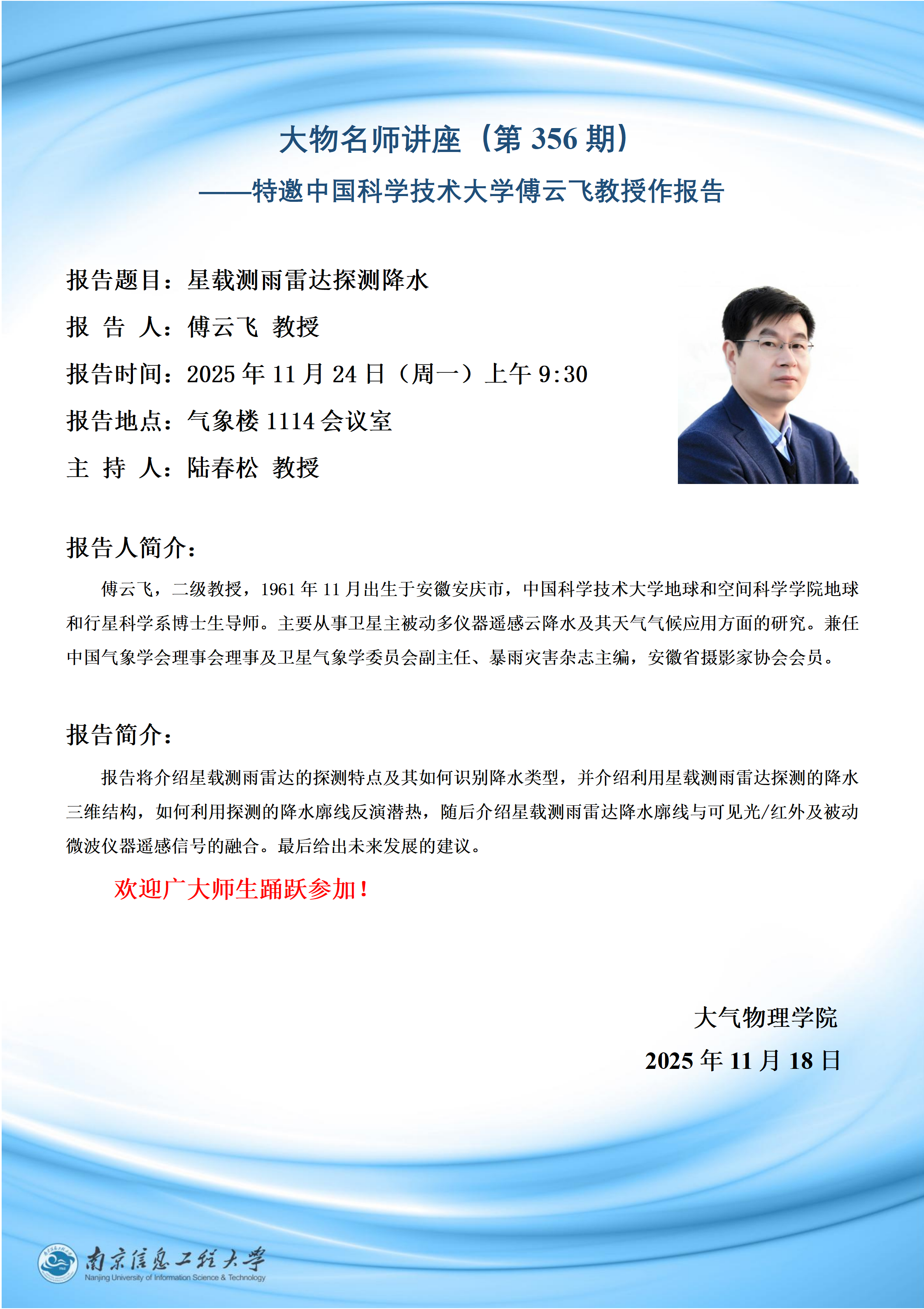 特邀国家卫星气象中心总工程师卢乃锰研究员来校作学术交流