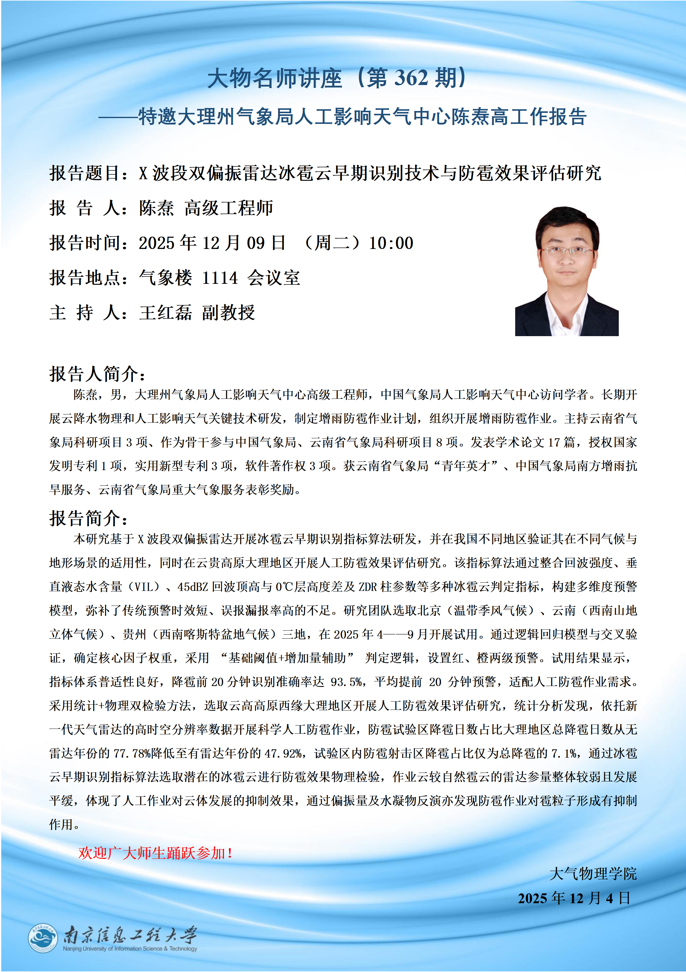 下一条:大物名师讲座(第361期)——特邀中国气象局人工影响天气中心楼小凤研究员作报告