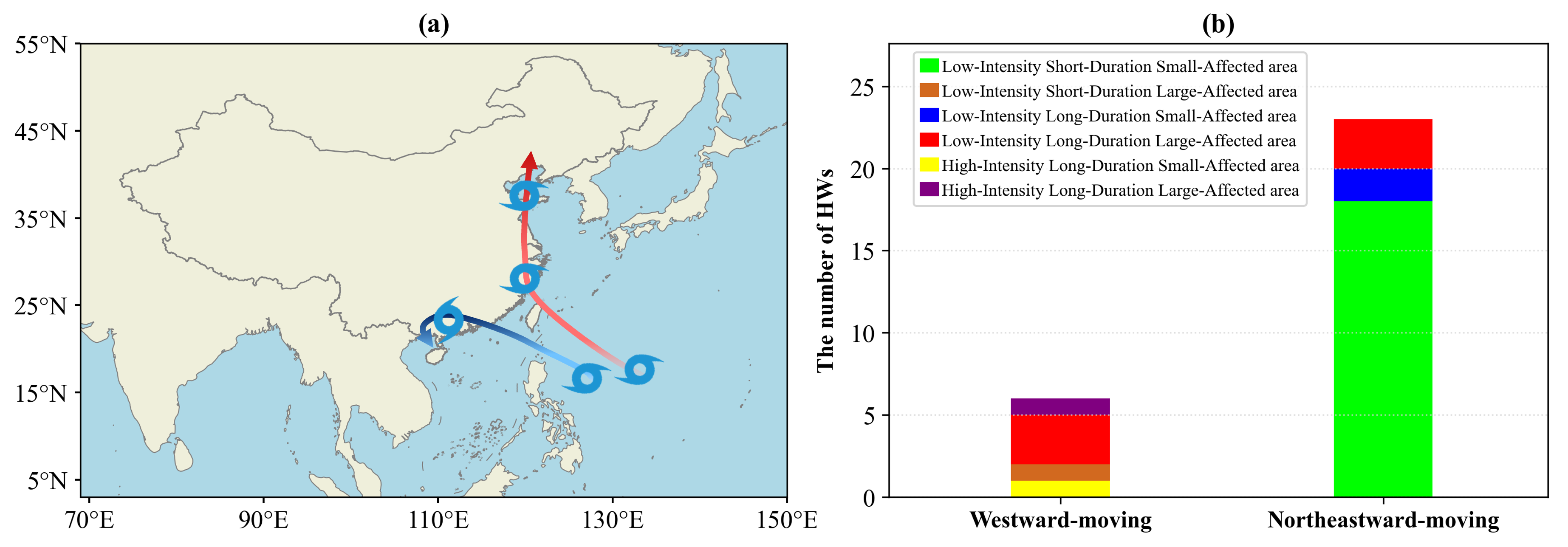 图1(a)两种台风路径的示意图。红色箭头表示向东北方向移动的台风路径,蓝色箭头表示向西移动的台风路径。(b)与这两种台风路径相关的区域热浪数量。