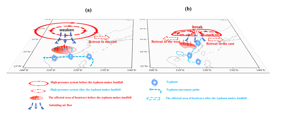 研究团队客观地追踪了1979—2022年中国夏季时空连续高温事件的三维演变,并深入研究了热浪的强度、持续时间和影响面积等特征。研究发现,与向西移动台风相关的热浪大多持续时间长、影响范围大,而与向东北移动台风相关的热浪则持续时间短、强度低、影响范围小。结果表明,高压系统通过增强地表加热和下沉增温影响区域热浪的触发和维持,而台风路径则可以调节区域热浪的消退。受强大内陆高压系统南侧东风气流引导而向西移动的台风,可以使高压系统缓慢向东撤退。这种相互作用导致区域热浪持续时间长、受影响范围大。相比之下,向东北方向移动的台风会迅速切断较弱的内陆高压系统,随后分裂的高压系统反过来又促进了台风的东北向移动,从而导致区域热浪强度低、持续时间短、受影响范围小。该研究工作系统地揭示了内陆高压系统与台风路径之间的相互作用,为提高时空连续高温热浪三维演变的预警和预测能力提供了新的视角。
