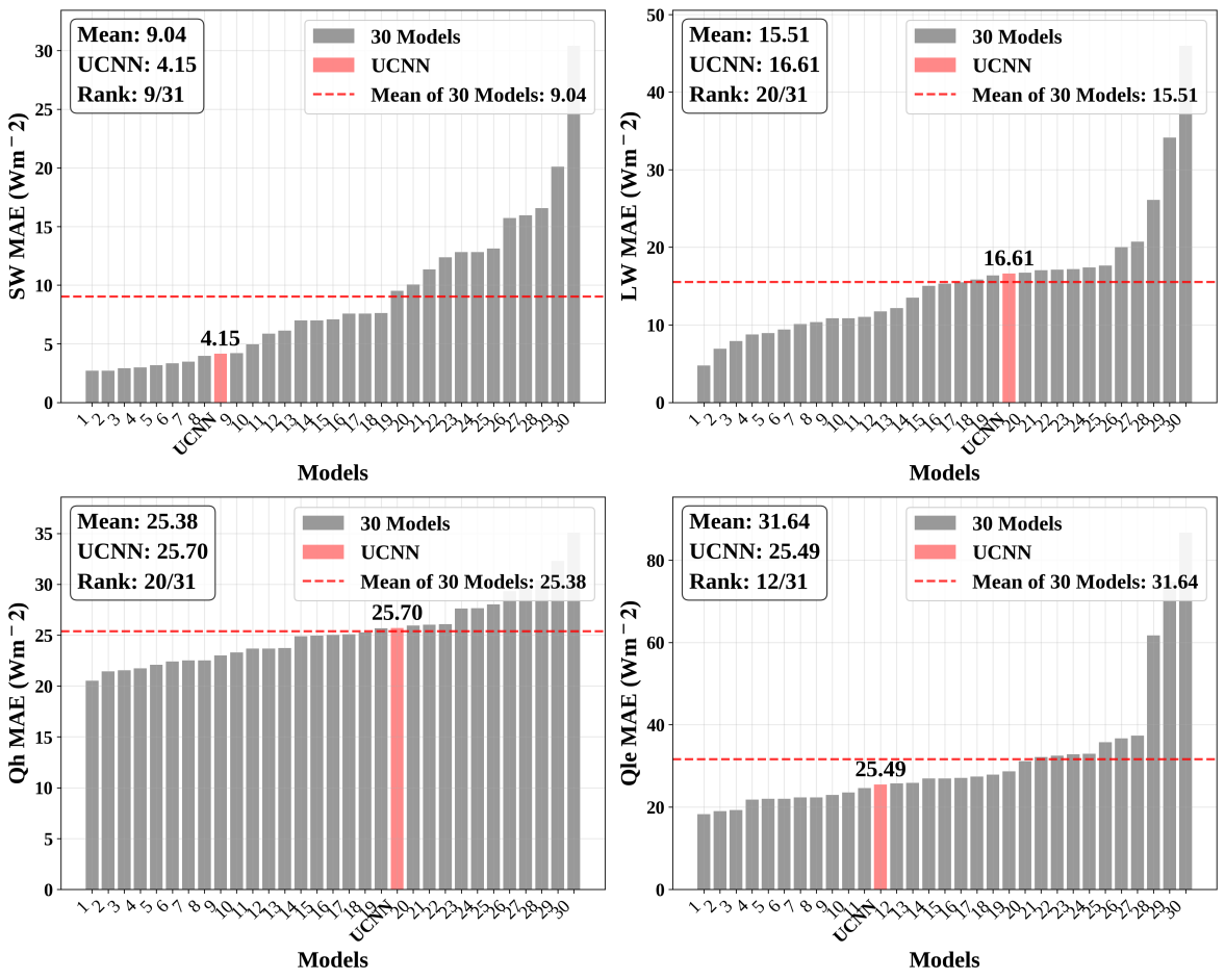 图2 UCNN在Preston站点与30个主流城市冠层模型的对比结果。结果表明,该模型在上行短波辐射和潜热通量等指标上达到或优于主流模型平均水平。